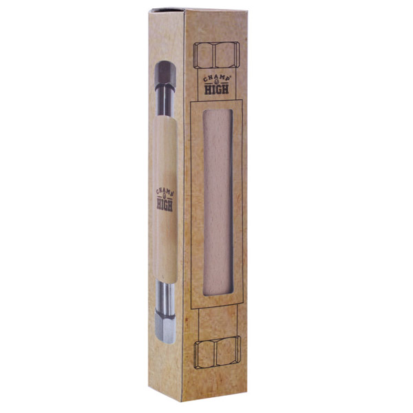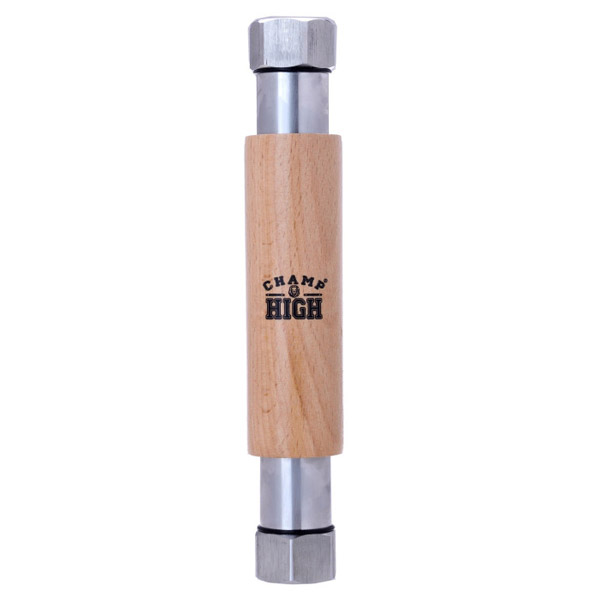 Масивният метален екстрактор Champ High е изработен от неръждаема стомана и е вграден в дървен цилиндър.