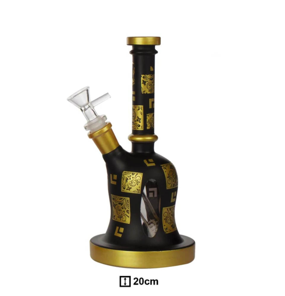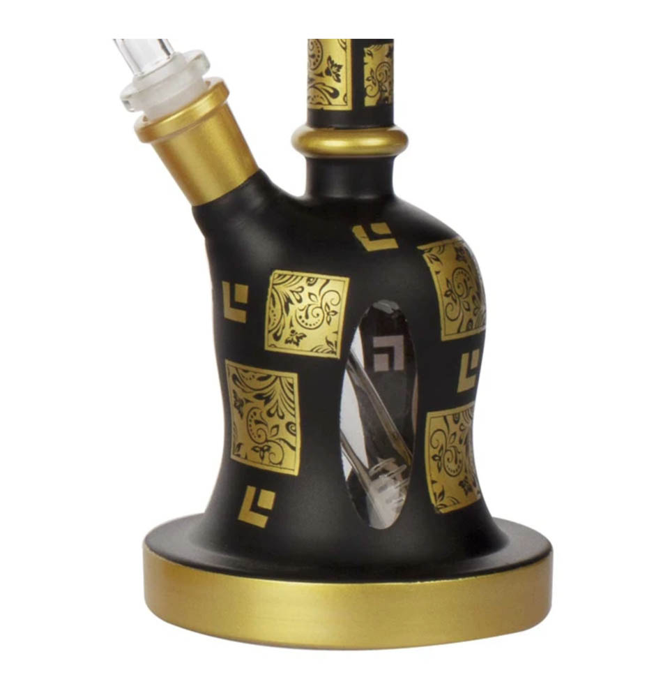 AMSTERDAM GOLDEN LIMITED e изработен от богато декорирано боросиликатно стъкло, боядисан в черно и злато с орнаменти по цялата повърхност на бонга.