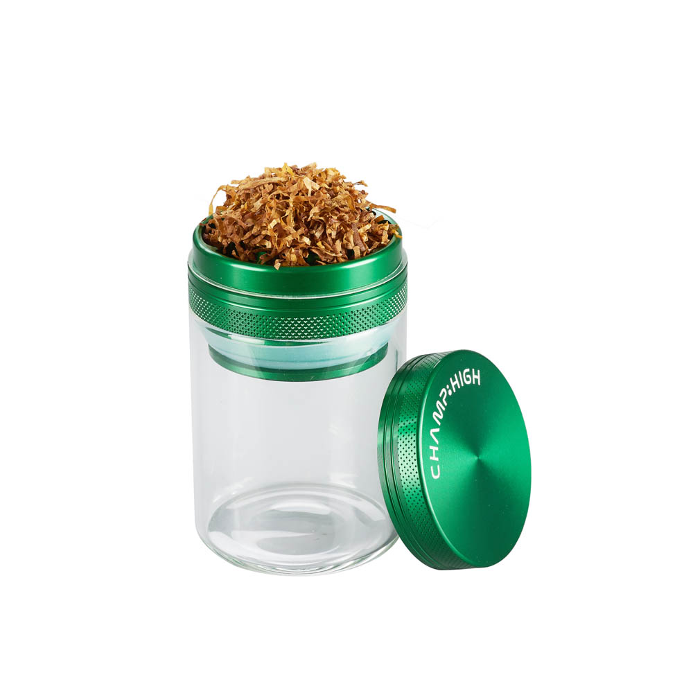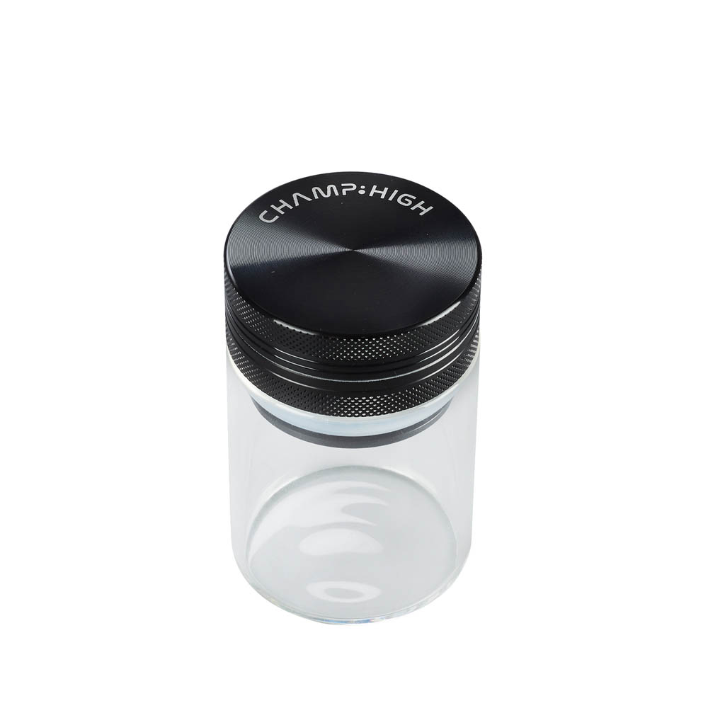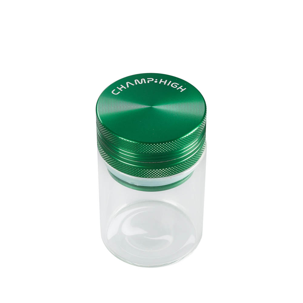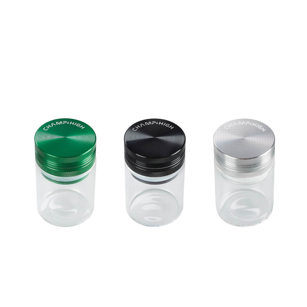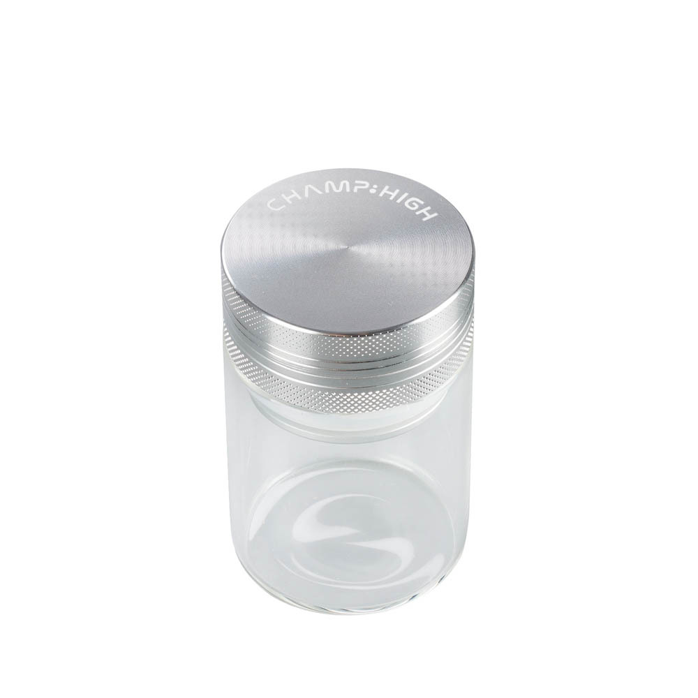 Метален грайндер с диаметър 50мм от серията Champ High с прикачен стъклен контейнер за съхранение.
